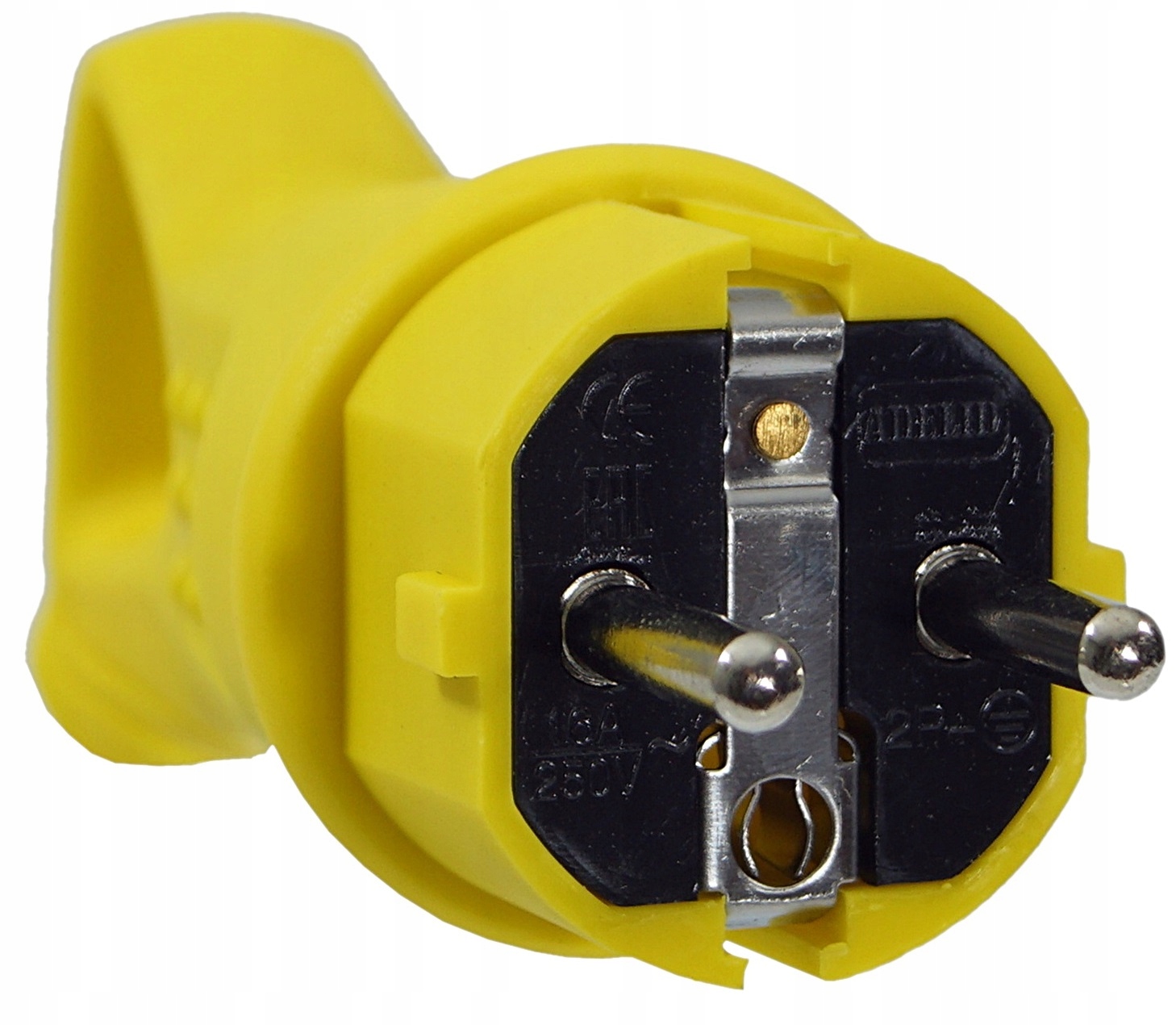Oryginalna wtyczka gumowa marki Adelid 16A 2P+Z, z uchwytem, w kolorze żółtym.