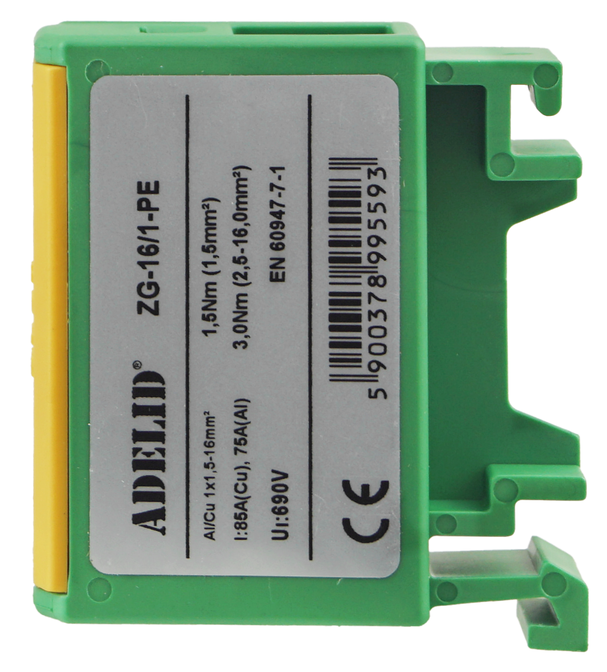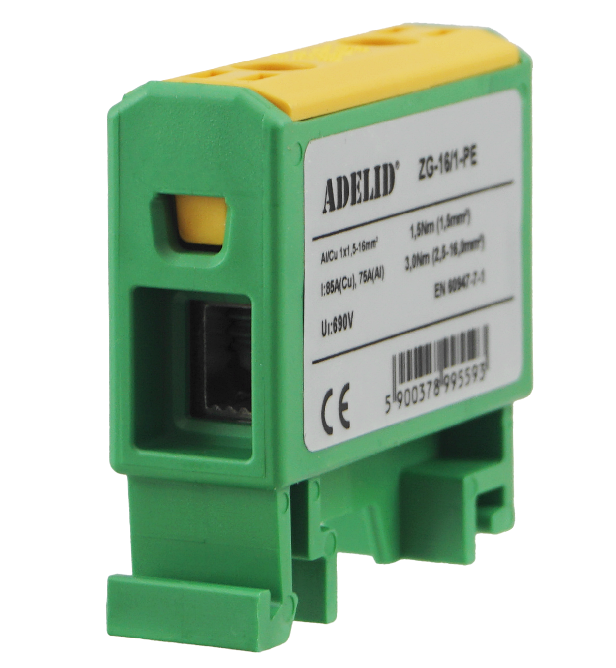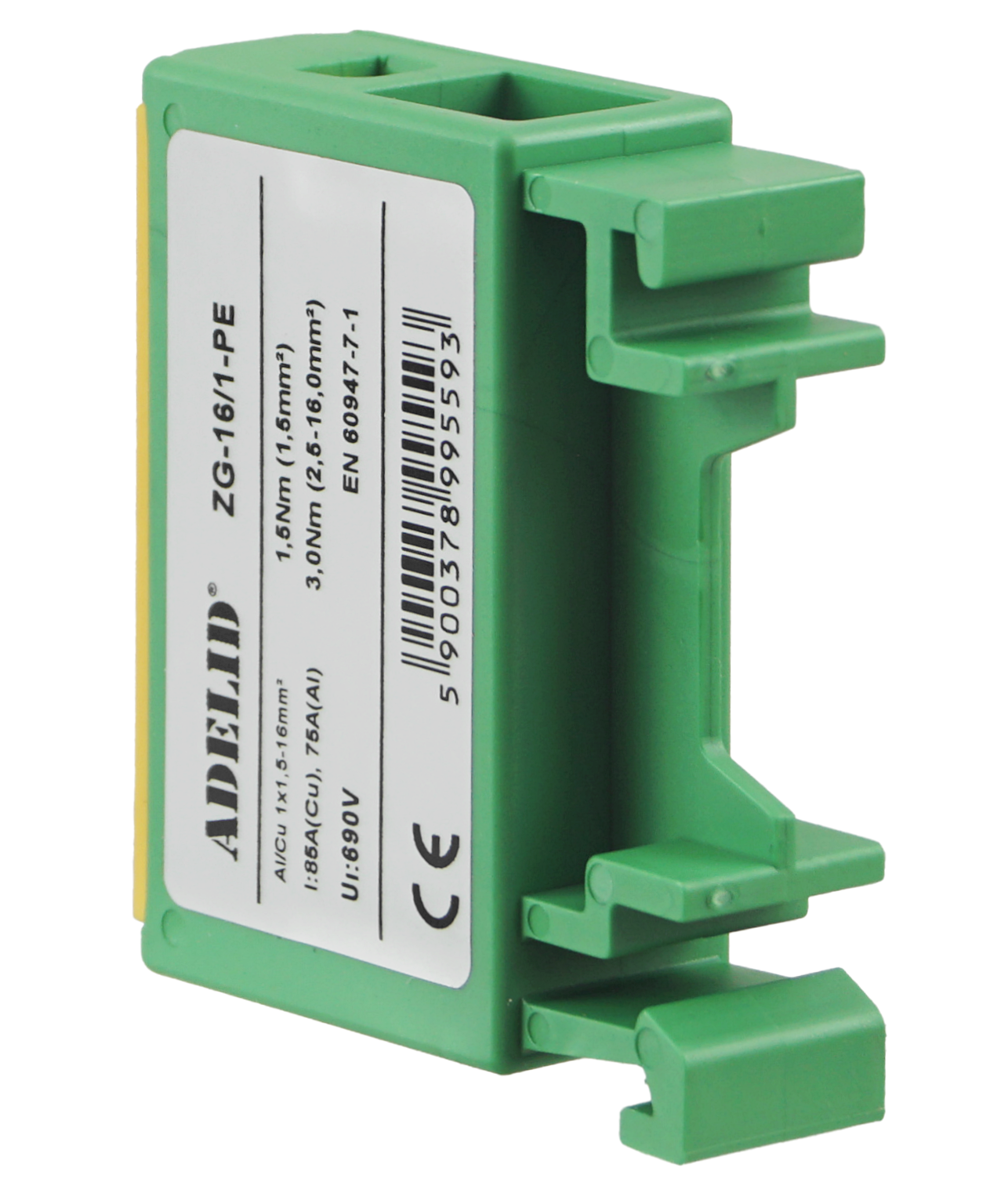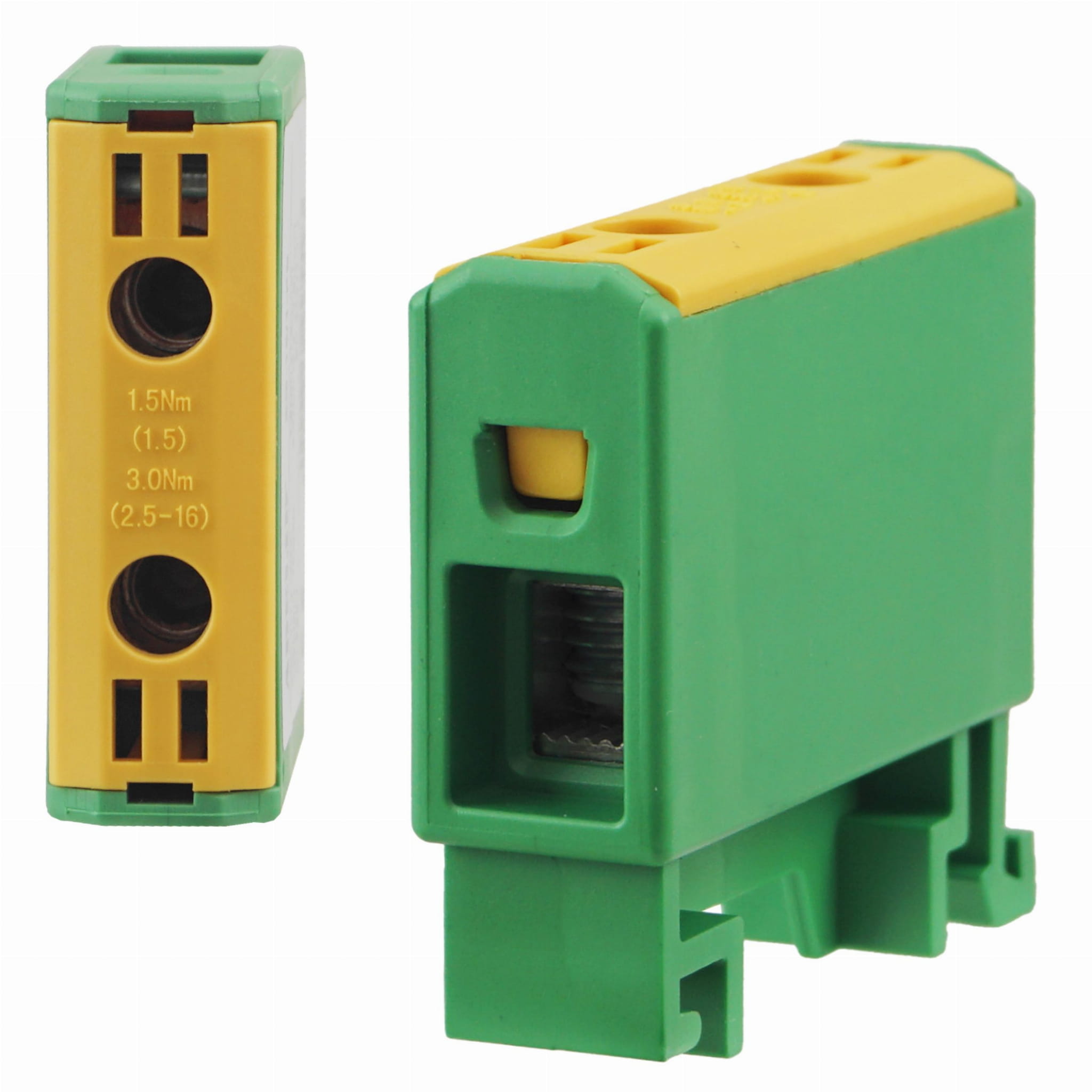 • Złączka szynowa gwintowa w kolorze żółto-zielonym, przeznaczona do montażu na standardowej szynie DIN 35 mm.
