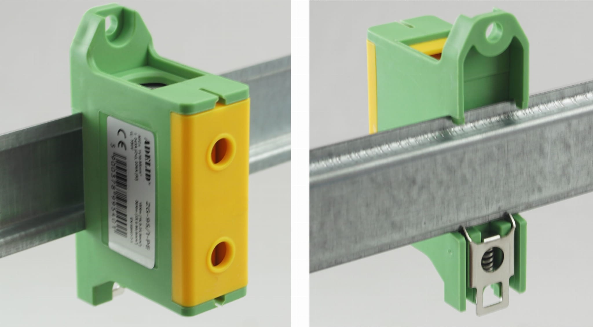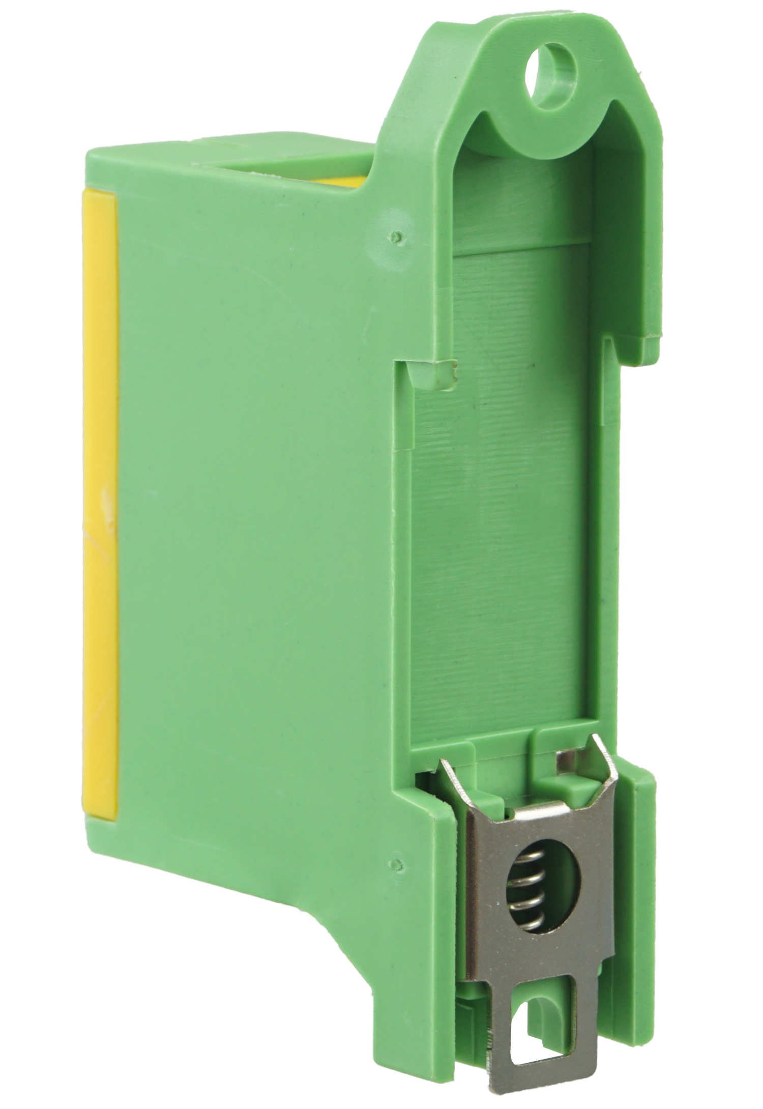 • Złączka szynowa gwintowa w kolorze zielono-żółtym, przeznaczona do montażu na standardowej szynie DIN 35 mm.