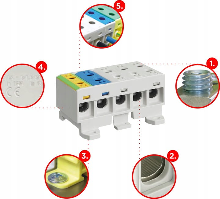 • 1. Imbusowy wkręt dociskowy, gwarantujący łatwe i trwałe mocowanie przewodu.