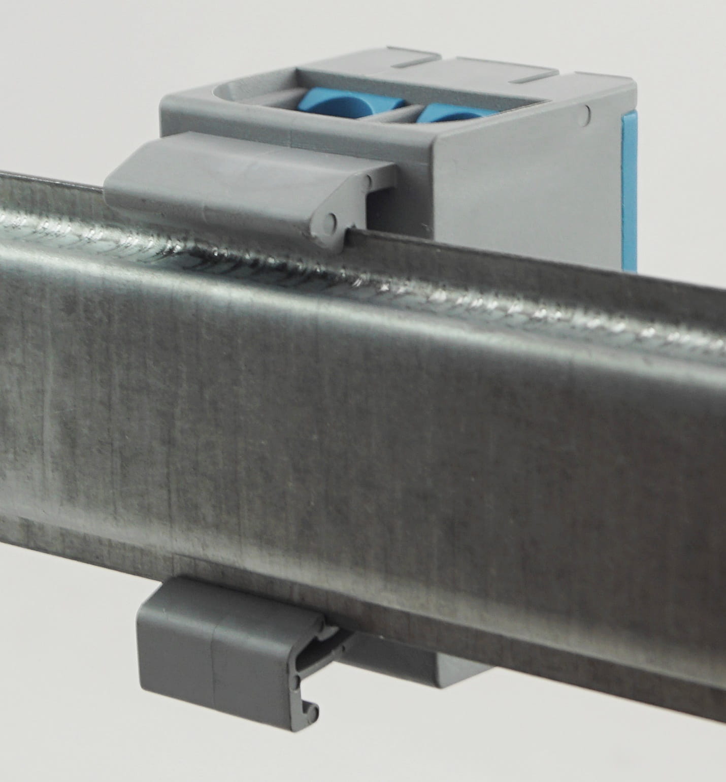 • Złączka szynowa gwintowa w kolorze szaro-niebieskim przeznaczona do montażu na standardowej szynie DIN 35 mm.