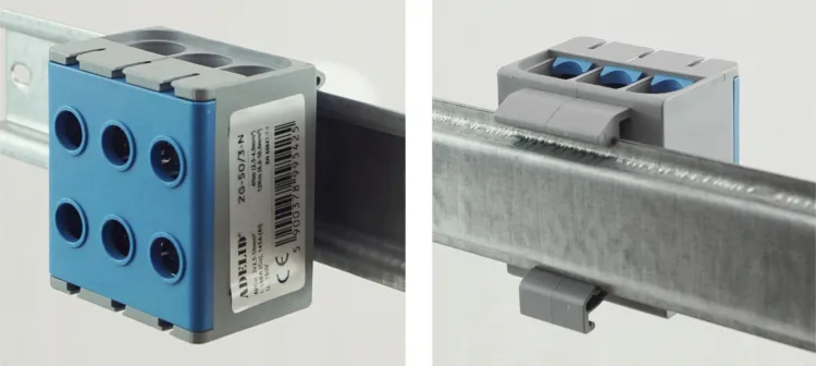 - Złączka szynowa gwintowa, z trzema torami dwuzaciskowymi, w kolorze szaro-niebieskim przeznaczona do montażu na standardowej szynie DIN 35 mm.