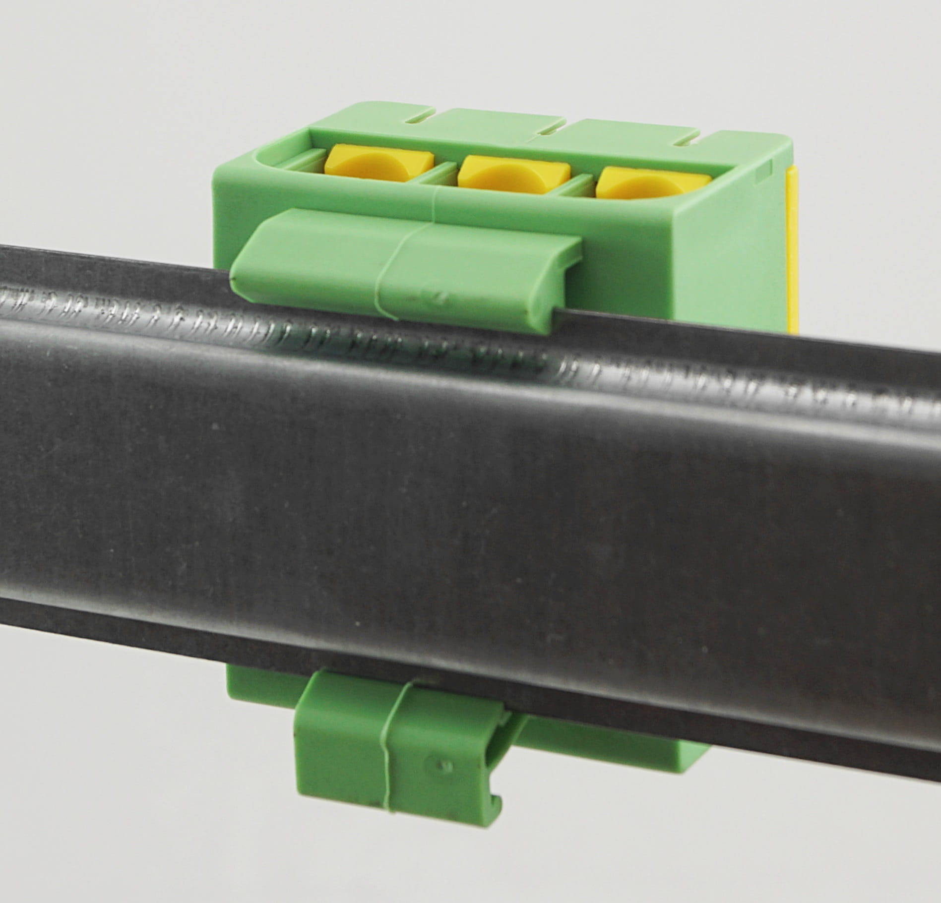 - Złączka szynowa gwintowa w kolorze żołto-zielonym, przeznaczona do montażu na standardowej szynie DIN 35 mm.