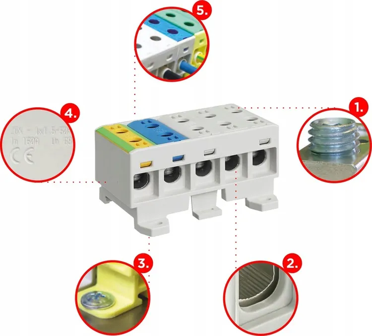 - 1. Imbusowy wkręt dociskowy, gwarantujący łatwe i trwałe mocowanie przewodu.
